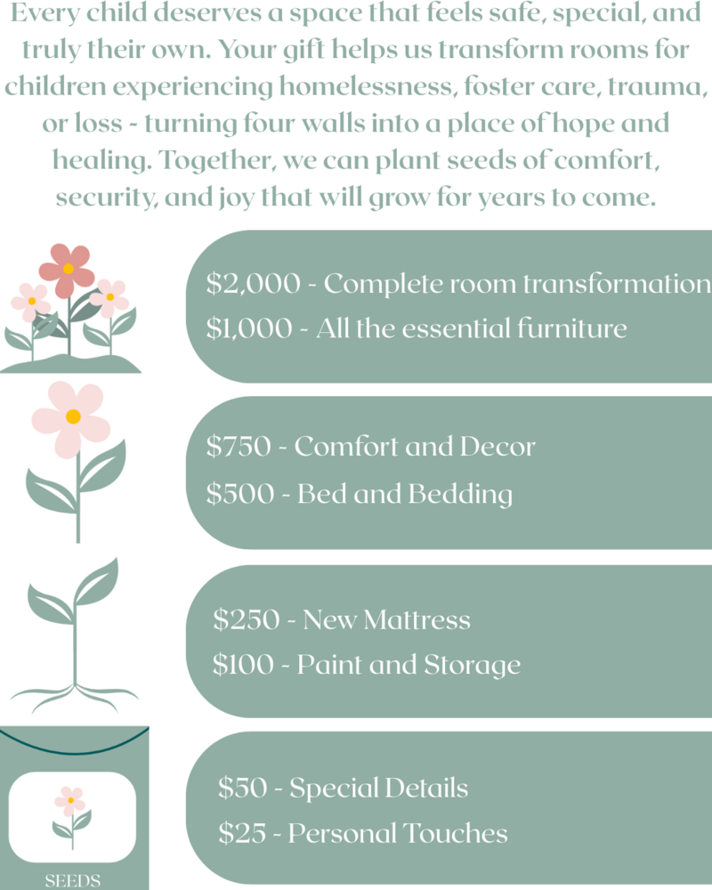 Your gift is not only transforms a child's space - it is also fully tax deductible as allowed by law. With Room To Grow is a registered 501(c)3 nonprofit organization